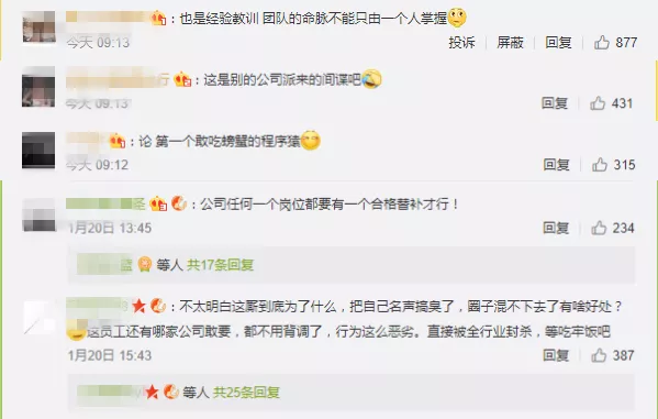 1月20日,深圳市螃蟹網(wǎng)絡科技有限公司創(chuàng)始人尹柏霖發(fā)文控訴,前員工燕某在游戲上線測試當天(2017年12月15日),鎖死服務器與電腦,并惡意失蹤,致公司損失慘重。尹柏霖稱,“我們上線不了也測試不了,等新員工到職后熟悉新代碼又是幾個月過去了?!?/p>