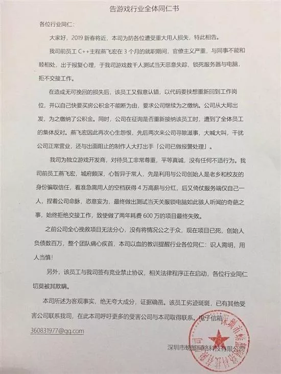 從微博大V“首席內(nèi)幕官”曬出的信息顯示,涉事程序員名叫“燕飛宏”,依仗服務端僅自己一人,捏著公司命脈,恣意妄為,在游戲測試當天關服鎖電腦,拒絕交接工作,致使做了2年耗費600萬元的項目最終失敗。