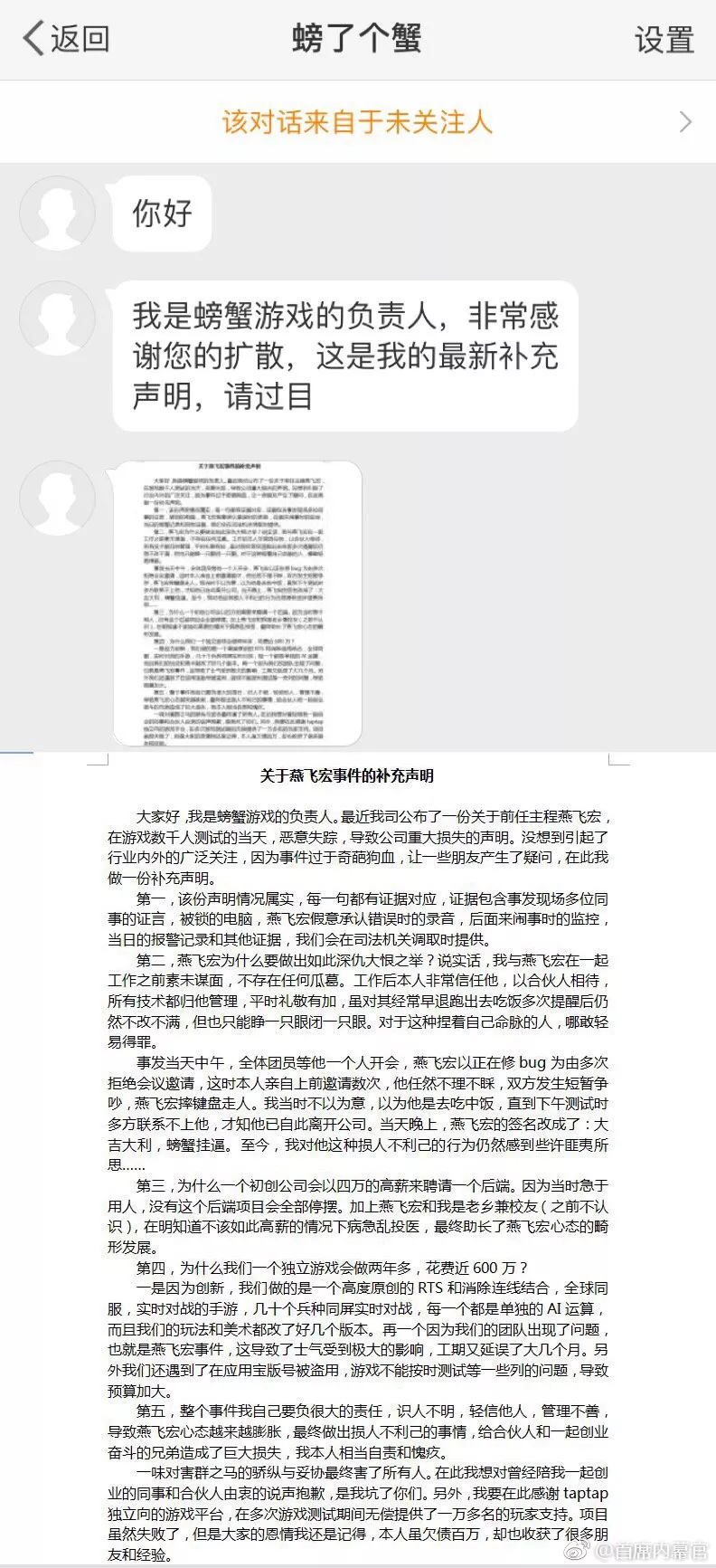 隨后,一位自稱是燕飛宏前同事的網(wǎng)友發(fā)文稱:之前的公司讓他做很簡(jiǎn)單的游戲,但是他三四個(gè)月連框架都沒(méi)寫出來(lái),業(yè)務(wù)能力只會(huì)用老套代碼,不愿意跟同事溝通,工作很不負(fù)責(zé)任、易暴躁、打人。