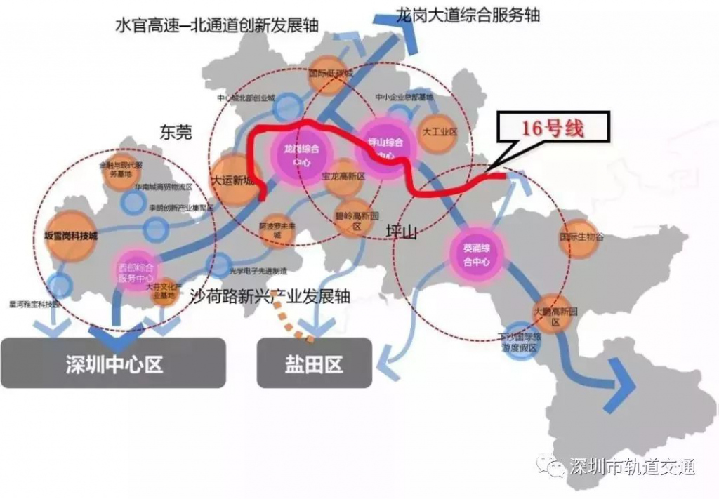 16號(hào)線起于龍崗大運(yùn)站,終于坪山田心站,串聯(lián)龍崗大運(yùn)中心、坪山高鐵站、坪山中心及田心地區(qū),其中大運(yùn)站途經(jīng)園山轄區(qū),同時(shí)該線南端預(yù)留大康、安良等站,是東部組團(tuán)內(nèi)部普速線路。該線路的建設(shè)將加強(qiáng)龍崗、坪山中心區(qū)的軌道服務(wù),增加?xùn)|部組團(tuán)內(nèi)部軌道覆蓋,促進(jìn)沿線城市化發(fā)展。