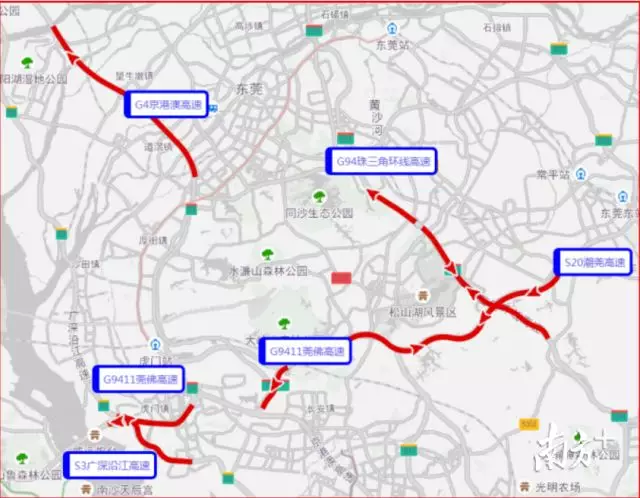 建議途經(jīng)廣深高速公路由深圳往廣州方向(北行)的車輛,在北行長(zhǎng)安出口、虎門出口繞行國(guó)道或轉(zhuǎn)到?;⒏咚俟返綇V州。