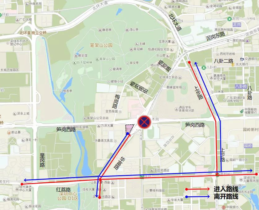 車行交通調整為:紅荔路 -百花二路;上步路 -筍崗西路 -百花四路上步路 -百花二路上步路 -百花一路。
