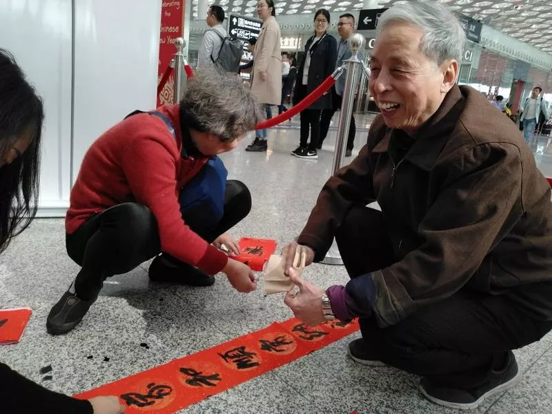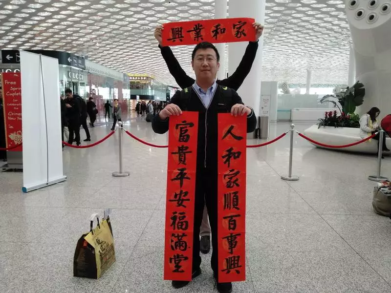 來領(lǐng)春聯(lián)的旅客里有國(guó)內(nèi)輾轉(zhuǎn)回老家的,有回國(guó)過年的,也有特地去國(guó)外過年的。來自江西婺源的曾老先生11點(diǎn)多的飛機(jī)飛往馬來西亞,今年他和老伴、孩子將在馬來西亞過年。他選的這兩幅春聯(lián)是他對(duì)新年的希望與祝福,將帶到馬來西亞貼起來,給新年增添年味兒?!拔疫€可以送給朋友,這是最好的禮物,他們一定會(huì)喜歡的?!痹壬吲d地說。