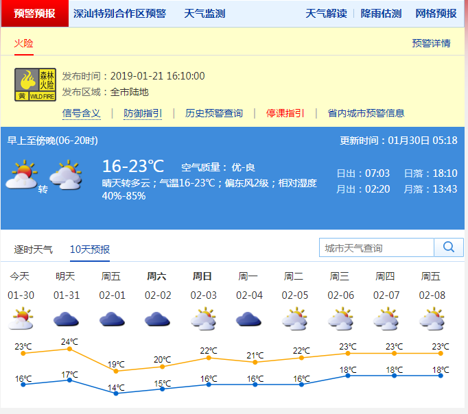 深圳新聞網(wǎng)2019年1月30日訊 深圳今日天氣多云,氣溫16-23℃,東風(fēng)2-3級,相對濕度40%-80% ;31日多云轉(zhuǎn)陰天,偶有零星小雨;2月1日受冷空氣影響,有分散小雨,沿海和高地最大陣風(fēng)7級,氣溫下降,天氣轉(zhuǎn)涼;2-3日多云,早晚有輕霧,氣溫上升;4-5日陰天間多云,有輕霧和短時小雨。