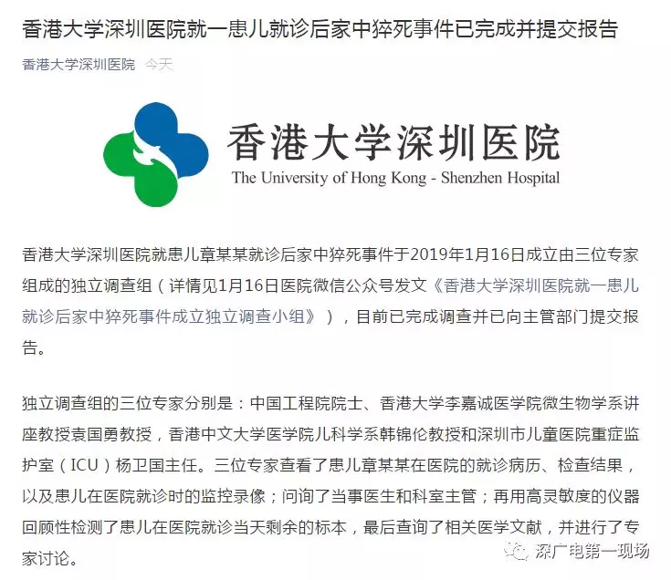 深廣電第一現(xiàn)場2019年2月1日訊 深圳8歲女孩患病前往香港大學(xué)深圳醫(yī)院就診,醫(yī)院兩次診斷均是上呼吸道感染,但孩子遵照醫(yī)囑吃完藥后病情并沒有好轉(zhuǎn)。在1月3日上午突然惡化,經(jīng)搶救無效死亡。 1月16日,香港大學(xué)深圳醫(yī)院發(fā)布消息稱,香港大學(xué)深圳醫(yī)院就患兒章某某就診后家中猝死事件成立獨(dú)立調(diào)查組。 1月31日,香港大學(xué)深圳醫(yī)院再次發(fā)布消息,稱就患兒就診后家中猝死事件已完成調(diào)查并提交報(bào)告。全文如下: 香港大學(xué)深圳醫(yī)院就患兒章某某就診后家中猝死事件于2019年1月16日成立由三位專家組成的獨(dú)立調(diào)查組(詳情見1月16日醫(yī)院微信公眾號(hào)發(fā)文《香港大學(xué)深圳醫(yī)院就一患兒就診后家中猝死事件成立獨(dú)立調(diào)查小組》),目前已完成調(diào)查并已向主管部門提交報(bào)告。 獨(dú)立調(diào)查組的三位專家分別是:中國工程院院士、香港大學(xué)李嘉誠醫(yī)學(xué)院微生物學(xué)系講座教授袁國勇教授,香港中文大學(xué)醫(yī)學(xué)院兒科學(xué)系韓錦倫教授和深圳市兒童醫(yī)院重癥監(jiān)護(hù)室(ICU)楊衛(wèi)國主任。三位專家查看了患兒章某某在醫(yī)院的就診病歷、檢查結(jié)果,以及患兒在醫(yī)院就診時(shí)的監(jiān)控錄像;問詢了當(dāng)事醫(yī)生和科室主管;再用高靈敏度的儀器回顧性檢測了患兒在醫(yī)院就診當(dāng)天剩余的標(biāo)本,最后查詢了相關(guān)醫(yī)學(xué)文獻(xiàn),并進(jìn)行了專家討論。 三位專家已出具了最終調(diào)查報(bào)告。報(bào)告確定了患兒感染的類型,分析了患兒猝死的原因很可能為心源性并發(fā)癥,并為今后避免類似事件再次發(fā)生提供了建議。報(bào)告指出醫(yī)院的診療過程符合專業(yè)規(guī)范。 2019年1月25日上午,醫(yī)院已將報(bào)告的內(nèi)容悉數(shù)告知患兒章某某家長,并對(duì)家長進(jìn)行了慰問。同日,醫(yī)院也將報(bào)告上報(bào)給了主管部門。 由于報(bào)告的部分內(nèi)容涉及患兒及其家人隱私,以及報(bào)告的部分內(nèi)容依據(jù)《中華人民共和國傳染病防治法》規(guī)定,醫(yī)院沒有權(quán)限向公眾公開,所以醫(yī)院無法公布報(bào)告全文。 醫(yī)院一直秉持公開、專業(yè)、科學(xué)的方式處理這一個(gè)案,尋求真相,并依此對(duì)診療工作進(jìn)行持續(xù)改進(jìn),促進(jìn)醫(yī)學(xué)的進(jìn)步。醫(yī)院也正在等待第三方的尸檢結(jié)果。 最后,醫(yī)院對(duì)獨(dú)立調(diào)查組的三位專家致以誠摯的謝意,感謝他們?cè)诙潭虜?shù)天時(shí)間內(nèi),認(rèn)真、細(xì)致、嚴(yán)謹(jǐn)?shù)赝瓿闪苏{(diào)查,并撰寫了報(bào)告。 香港大學(xué)深圳醫(yī)院 2019年1月31日