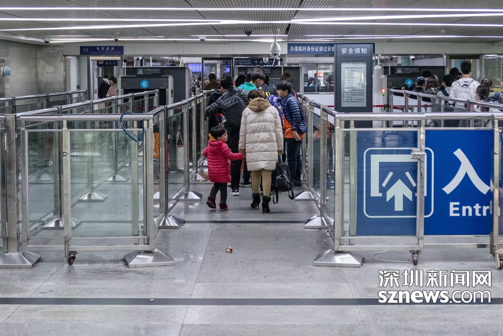2月2日18:10深圳站廣深列車進(jìn)站處,旅客安檢進(jìn)站(實(shí)習(xí)生 關(guān)天宇攝)