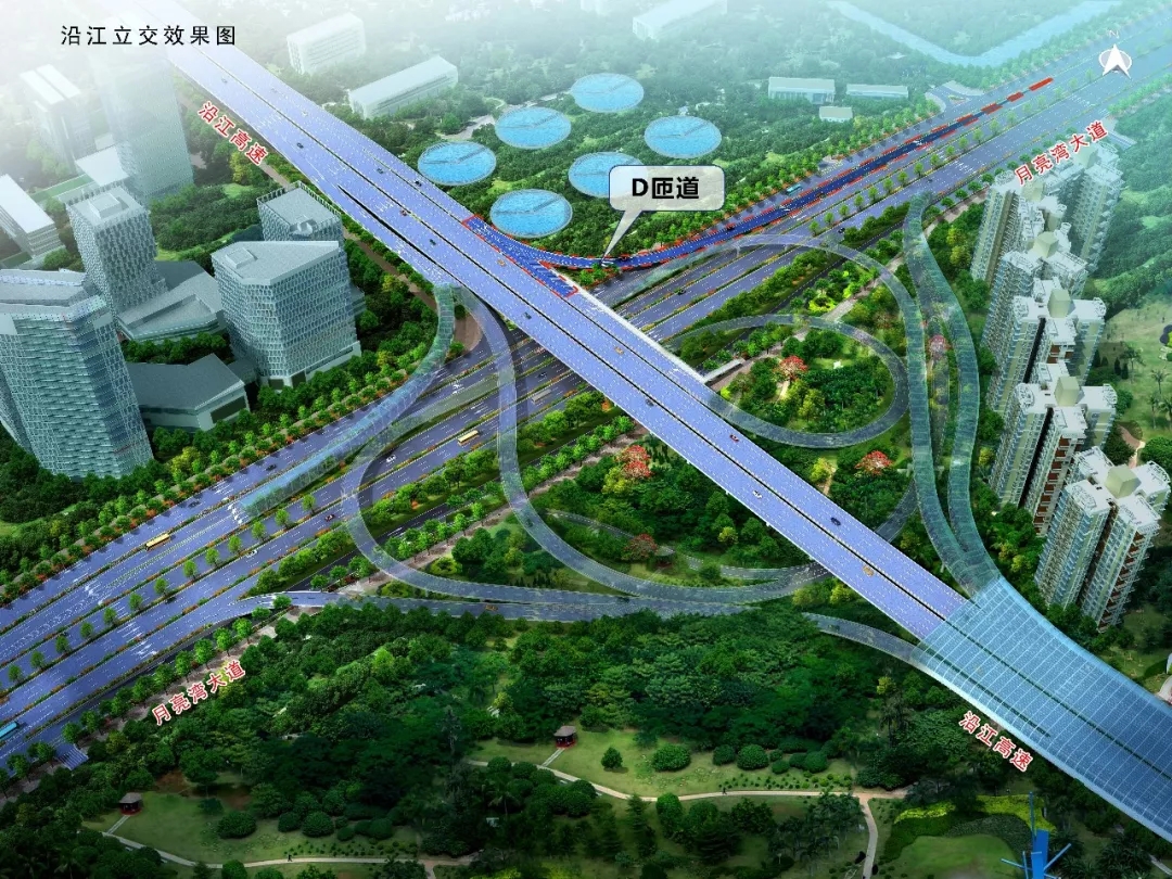 建成后車輛沿月亮灣大道南行可通過(guò)D匝道直接進(jìn)入沿江高速往廣州方向行駛。