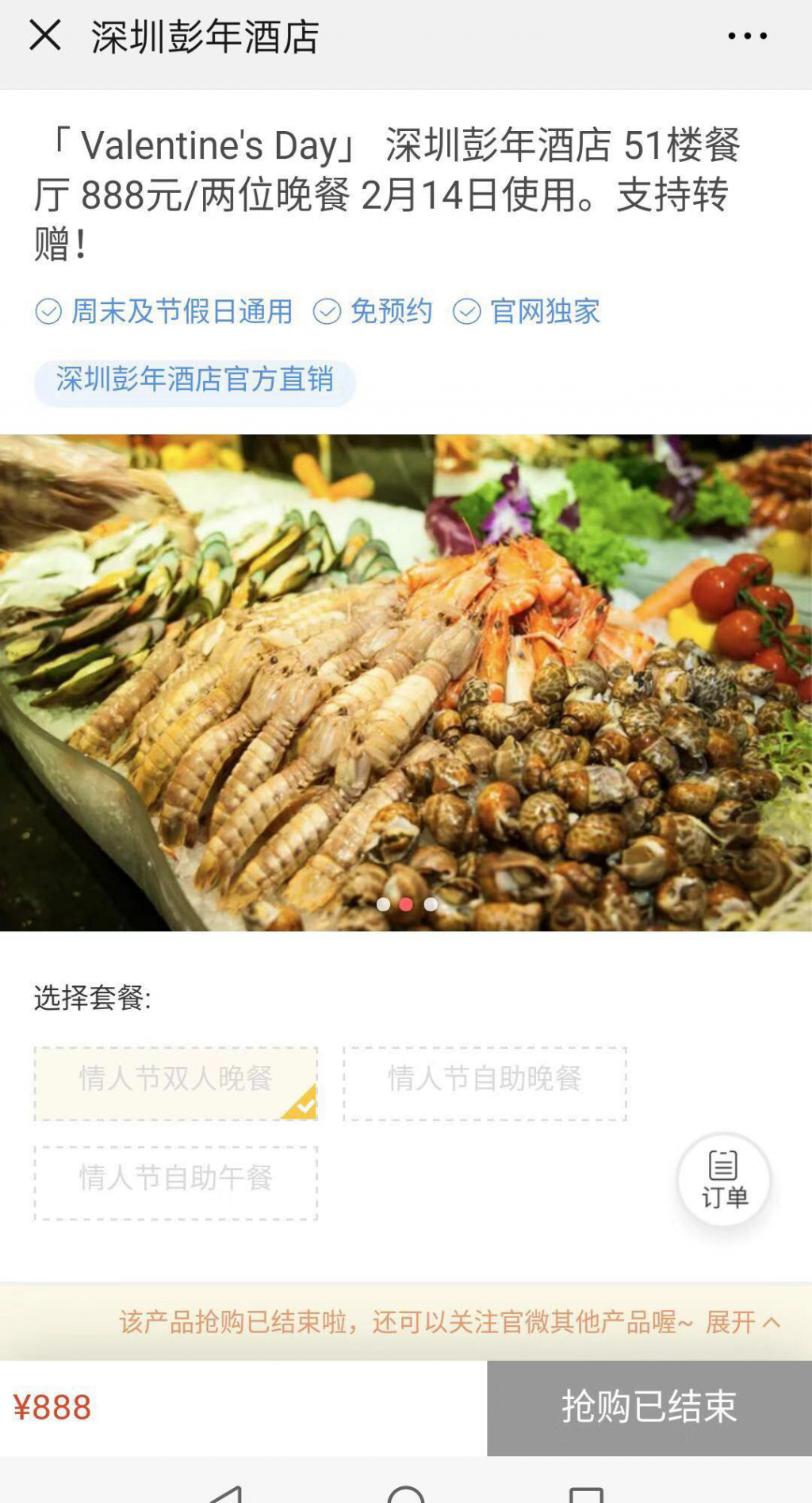 梅先生家住羅湖區(qū),2月14日情人節(jié)將至,他打算和女朋友找一個有節(jié)日氣氛的地方共進晚餐。2月13日,梅先生在深圳彭年酒店的微信公眾號上搶購了一個888元情人節(jié)雙人晚餐,并支付了所有費用。據(jù)了解,該情人節(jié)雙人晚餐是該酒店推出的"Valentine’ s Day"51樓餐廳888元 /兩位晚餐,套餐內(nèi)容包含情人節(jié)自助晚餐、小提琴表演、晚餐抽獎,其中特等獎為總統(tǒng)套房(限2月14日使用),還有一至五等獎5個獎項。