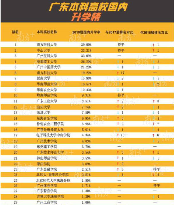 在發(fā)布“薪酬榜”后(點擊查看“薪酬榜”),今天南方教育智庫繼續(xù)獨家推出廣東高?!吧龑W(xué)榜”,梳理全省123所高校發(fā)布的《2018年畢業(yè)生就業(yè)質(zhì)量年度報告》的關(guān)鍵數(shù)據(jù),聚焦畢業(yè)生的深造路徑和升學(xué)比例。其中南方醫(yī)科大學(xué)、中山大學(xué)、廣州醫(yī)科大學(xué)本科畢業(yè)生國內(nèi)升學(xué)率位列前3名,均超過33%。