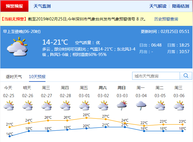 深圳新聞網(wǎng)2019年2月25日訊 記者從深圳市氣象局了解到,24日降雨結束,天色趨于明朗,白天最高氣溫18℃左右。預計25日起多云可見陽光,氣溫逐日回升,有輕霧或霾,轉(zhuǎn)溫暖濕潤天氣。展望3月我市天氣偏暖,空氣潮濕,雨霧等低能見度天氣易發(fā)。3月仍有3-4次弱冷空氣影響,強度比本次冷空氣弱,但冷空氣活動時氣溫都會比前日略降,并轉(zhuǎn)陰雨天氣。