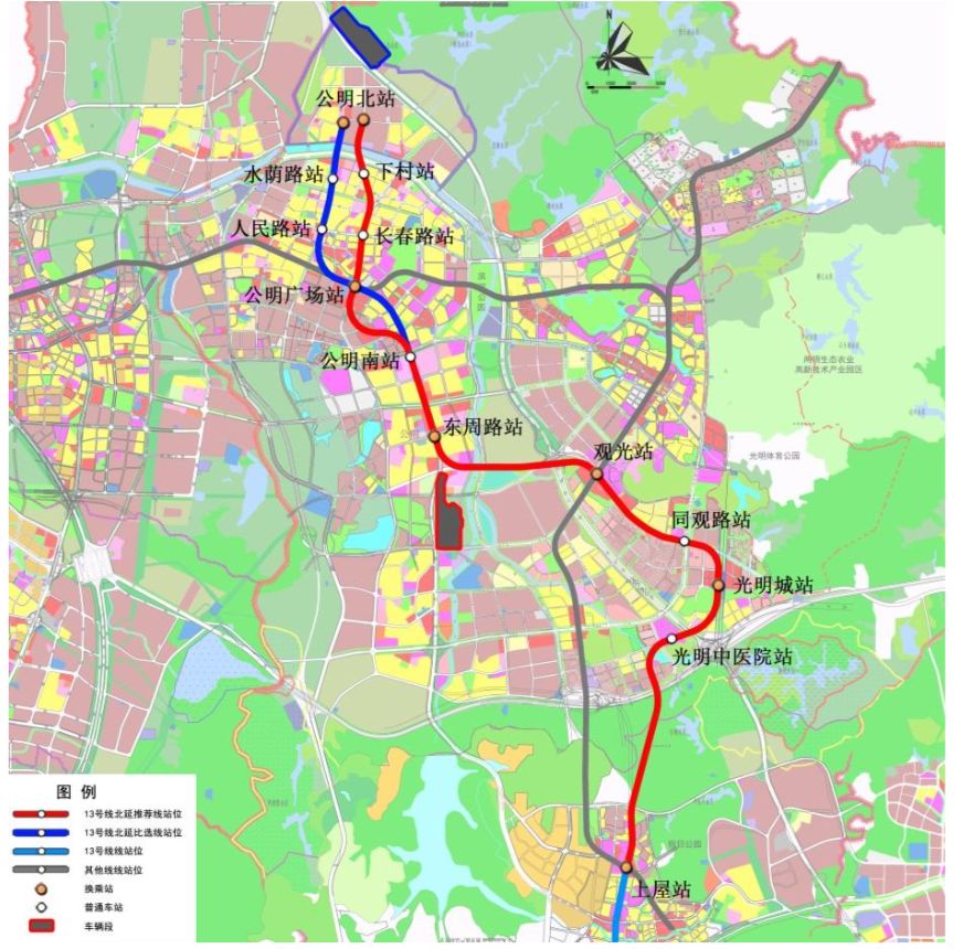 13號線北延線位于深圳市光明區(qū)境內,整個線路總體呈南北走向,由13號線一期工程設計終點上屋北站向北,自大眼山隧道引出,進入鵝頸西路,在光明城站和18號線、廣深港客運專線換乘后,向北轉向觀光路,在觀光站與6號線換乘,穿過東明大道濕地公園轉向松白路,沿松白路向北,進入公明廣場站,與6號線換乘,轉入長春路,沿長春路向北再轉入炮臺路,終止于公明北站。線路全長約19.2km,采用地下敷設。