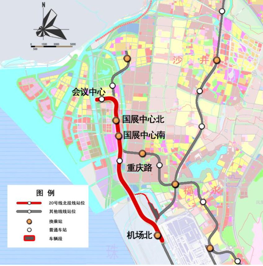 20號線北段起于寶安國際機場規(guī)劃 T4航站樓,在規(guī)劃 T4航站樓北側,11號線東側設機場北站,與11號線、穗莞深城際線換乘。之后線路往北沿展覽大道敷設,經蠔業(yè)路后轉向北,于重慶路北側,展覽大道東側設重慶路站。線路繼續(xù)往北,沿新會展中心東側道路敷設,于景芳路南側設國展中心南站,與12號線換乘,在鳳塘大道路口設國展中心北站,與12號線、30號線換乘。線路自國展中心北站引出后,于和蕙路向東敷設,于海濱大道東側設會議中心站。線路全長約8.4km,采用地下敷設。