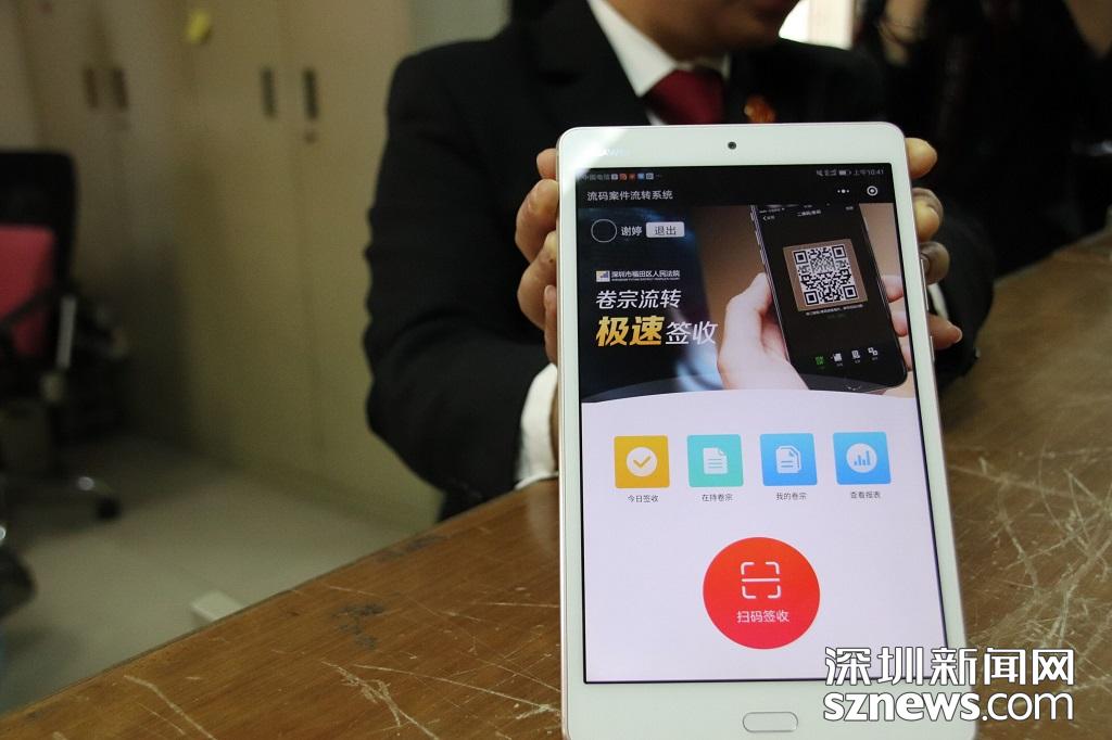 法官謝婷展示福田法院的流碼案件流轉(zhuǎn)系統(tǒng),該系統(tǒng)可節(jié)省80%的簽卷時間