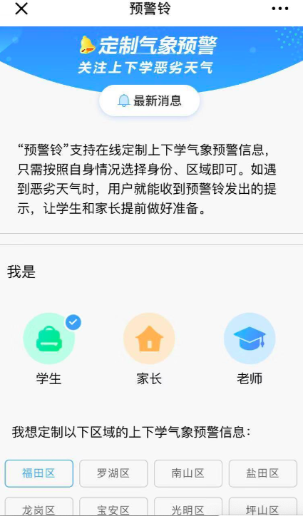 開學(xué)首日,深圳市氣象局就聯(lián)合深圳市教育局推出上下學(xué)時段高級別臺風(fēng)暴雨預(yù)警提示服務(wù)——“預(yù)警鈴”,廣大學(xué)生和家長可以通過關(guān)注“深圳天氣”微信公眾號進入“市民互動→預(yù)警鈴”頁面定制上下學(xué)預(yù)警信息,及時掌握自己所在區(qū)域的天氣狀況,合理安排出行,保障學(xué)生安全。