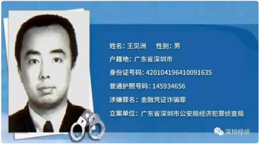 犯罪嫌疑人姓名:王見洲,男,1964年10月9日生,漢族,籍貫湖北省武漢市,戶籍地廣東省深圳市,身份證號(hào)碼:420104196410091635,普通護(hù)照號(hào)碼:145934656,原中國(guó)工商銀行深圳分行紅圍支行泥崗辦事處副主任。因涉嫌金融憑證詐騙罪于1998年12月潛逃出境。國(guó)際刑警組織于2016年11月14日對(duì)王見洲發(fā)布紅色通報(bào)。