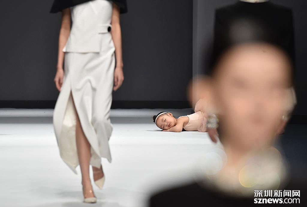 品牌OBBLIGATO展示環(huán)節(jié),一位參展的小孩子趴在T臺(tái)上睡著了