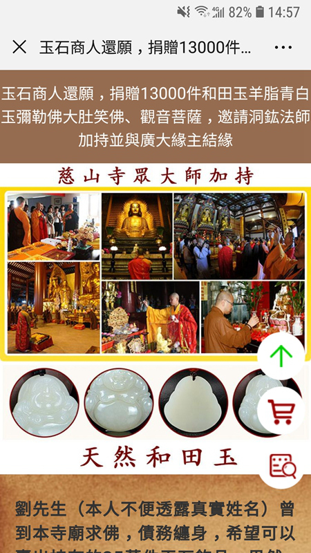 "劉先生(本人不便透露真實姓名)曾到本寺廟求佛,債務(wù)纏身,希望可以賣出持有的35萬件玉石飾品,果然三個月左右被大陸采購商出價3000多萬人民幣買走,償還完所有債務(wù)后,男子便帶著剩余的13000多件庫存玉器到寺廟還愿......"