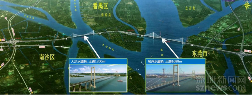 由廣東省交通集團投資建設的虎門二橋項目,全長12.89公里,雙向八車道,設計行車速度為100公里每小時,設計使用壽命100年。路線起于廣州市南沙區(qū)東涌鎮(zhèn),順接國道主干線廣州繞城高速公路南環(huán)段,同時與廣珠北線高速公路連接,經(jīng)廣州市南沙區(qū)、番禺區(qū)、先后跨越珠江大沙水道、海鷗島、坭洲水道后,穿越虎門港進入東莞市沙田鎮(zhèn),終點與廣深沿江高速公路相接,并預留與規(guī)劃中的河惠莞高速公路接口。