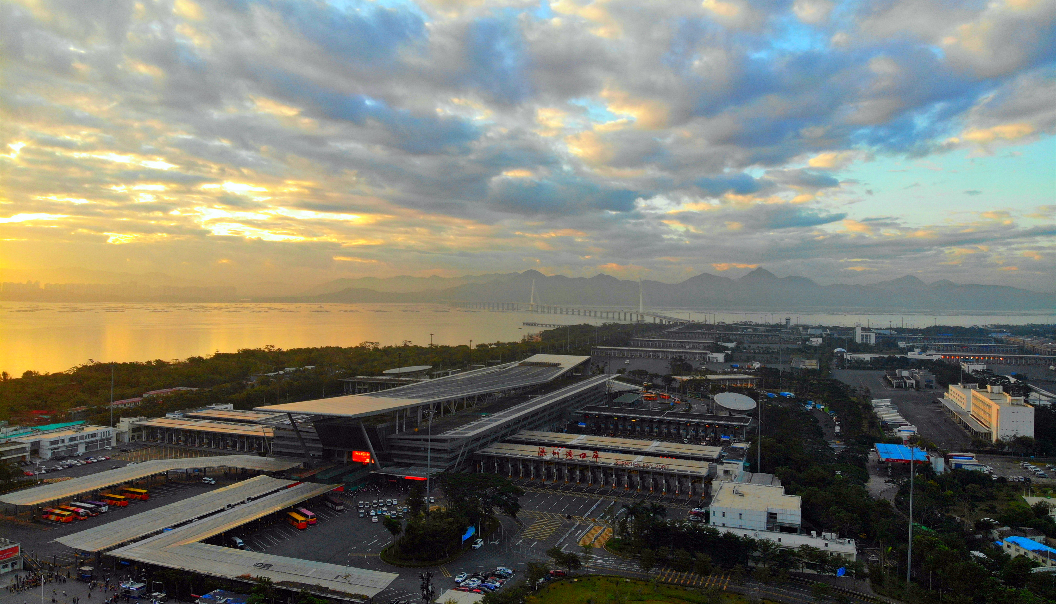深圳灣口岸和遠(yuǎn)處的深圳灣大橋