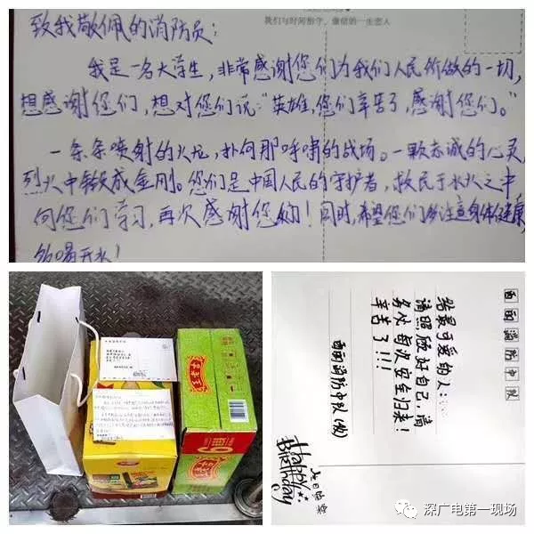 據(jù)消防員們介紹,收到的禮物中有牛奶、王老吉等飲料,有些是市民親自送上門的,有些則是由外賣員送來的,跟禮物一起的還有一些信件和紙條,也許從這里面,我們可知一二。
