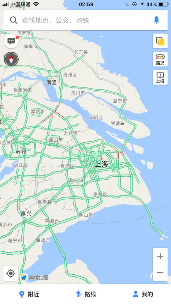 凌晨2點59分,上海周邊,紅色路段比較少,還算順暢的夜晚哦。