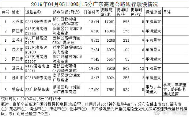 廣東交警部門此前預(yù)計,從4月4日至7日全省高速公路車流都將持續(xù)處于高位,出行最高峰出現(xiàn)在4月4日15時至5日凌晨2時。4月5日9時15分,廣東高速車通行緩慢長度超過5公里,時間超過30分鐘的路段共8個。