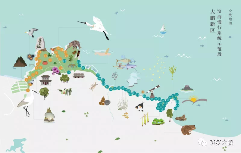大鵬新區(qū)根據(jù)線路的地形、山海景觀、人文景觀的分布,確定了“打造‘兩線、三段、五大節(jié)點’的濱海生態(tài)自然課堂步道”。據(jù)新區(qū)建筑工務(wù)局負(fù)責(zé)人介紹,從新大河入海口到大亞灣海岸鹿咀懸崖,全長18.7公里的海岸線上分布著河流、山林、海灘、溪流、濕地等多樣生態(tài)系統(tǒng)。2017年7月,大鵬新區(qū)按照濱海慢行系統(tǒng)示范工程標(biāo)準(zhǔn),動工建設(shè)新大-鹿嘴市政綠道?!皟删€”指的是沿著海岸的濱海徒步路線和城市二號綠道線,兩條線之間的6.6平方公里土地將形成一座開放的郊野公園;“三段”分別為活力生活段、自然生態(tài)段和休閑旅游段;“五大節(jié)點”為山海綠畔、古廟遺風(fēng)、東山凹、愛情灘、鹿咀山莊等自然景觀。