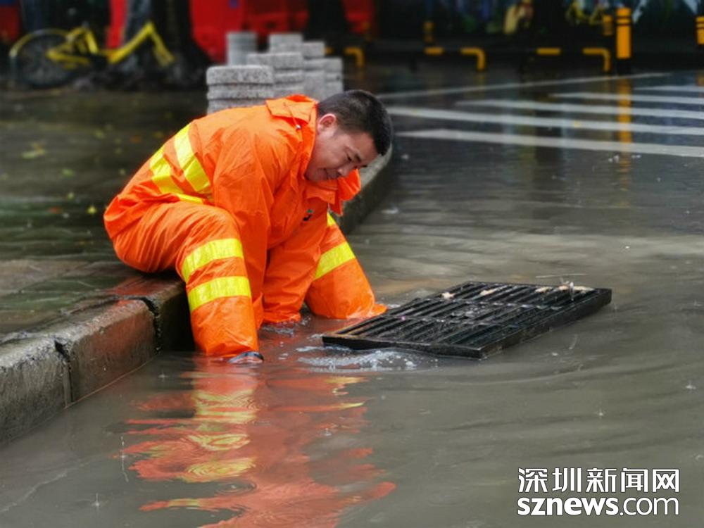 福田區(qū)中心二路和福華四路交界處東南角,工作人員正打開雨水篦子加速排水