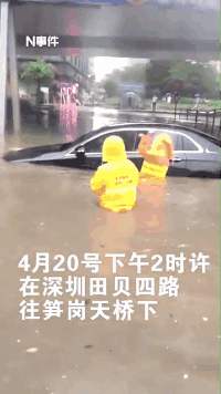 連日暴雨襲城,4月20日下午2時許,一深圳市民開車行駛到田貝四路往筍崗天橋下時,車已經(jīng)有大半被水浸沒。