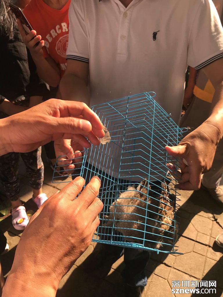 小區(qū)保安先把小貓頭鷹裝進(jìn)籠子,等待動(dòng)保所的工作人員到來(lái)。