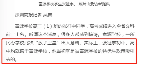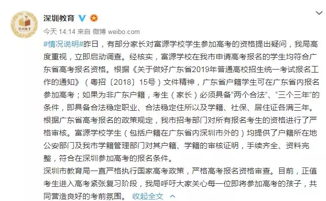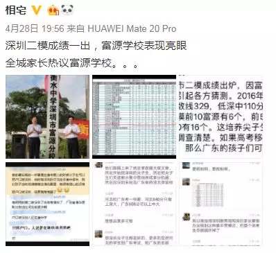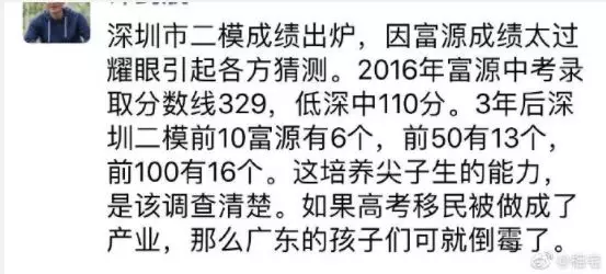 近日,深圳高三二模成績出爐,一所學(xué)校引起了深圳家長圈的高度關(guān)注。 有網(wǎng)友在微博上報料富源學(xué)校表現(xiàn)亮眼,一石激起千層浪,事件是怎么一回事呢?一起來看看 2019深二模各校尖子生成績 其中民辦學(xué)校寶安區(qū)富源學(xué)校異軍突起,尖子生占比遠(yuǎn)超深圳最好的四大高中(深圳中學(xué),深圳實驗中學(xué),深圳外國語學(xué)校,深圳高級中學(xué)),引人注目。 網(wǎng)友議論紛紛 網(wǎng)友@相宅稱:深圳富源中學(xué),18年考中清北的學(xué)生名單和初中來源統(tǒng)計,經(jīng)過人肉搜索和大數(shù)據(jù)比對,確認(rèn)相關(guān)證據(jù),有非常大的高考移民嫌疑。廣東高考本來就難,名校指標(biāo)更少,還來擠占惹起公憤。同時附上19年深圳高考二模的富源成績。今年還有沒有高考移民,還會不會擠占廣東的名校指標(biāo)? 針對網(wǎng)上的報料和家長的質(zhì)疑,深圳教育局@深圳教育回應(yīng)稱 情況說明 #情況說明#昨日,有部分家長對富源學(xué)校學(xué)生參加高考的資格提出疑問,我局高度重視,立即啟動調(diào)查。經(jīng)核實,富源學(xué)校在我市申請高考報名的學(xué)生均符合廣東省高考報名資格。根據(jù)《關(guān)于做好廣東省2019年普通高校招生統(tǒng)一考試報名工作的通知》(粵招〔2018〕15號)文件精神,廣東省戶籍學(xué)生可在廣東省內(nèi)報名參加高考;如果為非廣東戶籍,考生(家長)必須具備“兩個合法”、“三個三年”的條件,即具備合法穩(wěn)定職業(yè)、合法穩(wěn)定住所以及學(xué)籍、社保、居住證各滿三年。根據(jù)廣東省高考報名的政策規(guī)定,我市招考部門對所有報名考生的資格進(jìn)行了嚴(yán)格審核。富源學(xué)校學(xué)生(包括戶籍在廣東省內(nèi)深圳市外的)均提供了戶籍所在地公安部門及我市學(xué)籍管理部門對其戶籍、學(xué)籍的審核證明,手續(xù)齊全、資料完整,符合在深圳參加高考的報名條件。 深圳市教育局一直嚴(yán)格執(zhí)行國家高考政策,嚴(yán)格高考報名資格審查。目前,正值考生進(jìn)入高考緊張復(fù)習(xí)階段,我局呼吁大家關(guān)心每一位即將參加高考的孩子,共同營造良好的考前氛圍。 回應(yīng)之下,小編根據(jù)現(xiàn)有的資料,發(fā)現(xiàn)了這些信息出入,一起接著往下看! 對比:富源學(xué)校深圳一模成績 成績單顯示,在前十名單里,富源學(xué)校獨占6位,而深圳四大公辦重點高中總和也只有4位,這是什么情況?對照看一看一模成績: 三年來深圳中考錄取情況: 富源學(xué)??梢娚床徽純?yōu)勢 再來看一看三年來深圳中考錄取情況:富源學(xué)??梢娚床]有什么優(yōu)勢,總分460分的錄取分?jǐn)?shù)比四大重點低了將近100分,但也不能因此說明該學(xué)校沒有尖子生源。 2018年富源學(xué)校高考清北名單:9位同學(xué)上清北 下圖是2018年幾所大學(xué)在廣東(理科)招生計劃: 但是,這幾名考進(jìn)清北的同學(xué),名字竟然出現(xiàn)在兩所不同的高中??? 考進(jìn)廣東前20名的張征宇同學(xué) 網(wǎng)友爆料稱,深圳富源中學(xué)2018年高考喜報,特別宣傳了張征宇同學(xué)(后成功考入清華大學(xué))。而他也出現(xiàn)在2015年的邯鄲市育華中學(xué)中考喜報上。乾坤大挪移,坐地日行八萬里! 家長質(zhì)疑:富源中學(xué)光榮榜的同學(xué) 怎么又出現(xiàn)在衡水中學(xué)喜報上? 針對上面9位同學(xué),搜索信息顯示,竟然有五位同學(xué)來自有名的高考大省河北。 在2018年的第31和32屆化學(xué)奧林匹克競賽的名單上,有一個共同的名字:崔一龍,但他們來自不同的學(xué)校。高二時他在衡水第一中學(xué),高三他出現(xiàn)在深圳富源中學(xué)。 同時,該網(wǎng)友還發(fā)了一封 #一位深圳中學(xué)生家長寫給教育部的控訴信# 尊敬的國家教育部領(lǐng)導(dǎo): 您好! 我是深圳市一名中學(xué)生的家長。這幾日網(wǎng)上流傳出一份深圳市高三年級第二次模擬考試前幾名學(xué)校分布成績單,其中民辦學(xué)校寶安區(qū)富源學(xué)校異軍突起,遠(yuǎn)超深圳最好的四大高中(深圳中學(xué),深圳實驗中學(xué),深圳外國語學(xué)校,深圳高級中學(xué))引起廣大家長的關(guān)注。隨后網(wǎng)上流傳出是富源學(xué)校與河北衡水中學(xué)之間的高考移民消息,具體操作是通過將河北衡水中學(xué)的尖子生戶口轉(zhuǎn)移到深圳富源學(xué)校,平時在衡水中學(xué)上課,考試在深圳富源學(xué)校,并參加深圳市高考。此情況幾年前已有,數(shù)量沒有那么大。今年突然大量此類考生出現(xiàn),大家猜測,如果不加管控未來必將愈演愈烈。 作為一名普通深圳市民和學(xué)生家長,我守法遵紀(jì),但是實在難以接受這樣的現(xiàn)實。希望教育部能夠徹查此事,查明真相,還廣大家長和考生一個公道。 記者調(diào)查 網(wǎng)上傳出深圳高三二模數(shù)據(jù)圖,記者向深圳某中學(xué)老師證實了該表格的真實性。從數(shù)據(jù)中可看到,深圳二模全市前十共有11名,其中富源6名,深圳中學(xué)3名,深圳實驗學(xué)校和市高級中學(xué)各占1名。有家長質(zhì)疑這是富源學(xué)校從衡水中學(xué)引入了高考移民,才導(dǎo)致二模成績一下子拔尖,并已申請要求有關(guān)部門徹查。 同時,小編梳理去年的報道發(fā)現(xiàn),張征宇同學(xué)此前的采訪顯示:張征宇初中