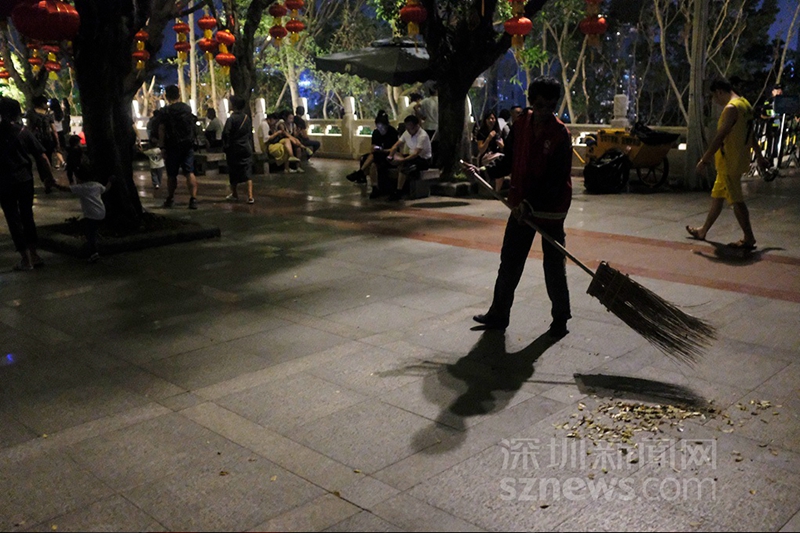 21時,燈光秀結束后,蓮花山公園山頂廣場打掃衛(wèi)生的環(huán)衛(wèi)工(楊浩翰 攝)