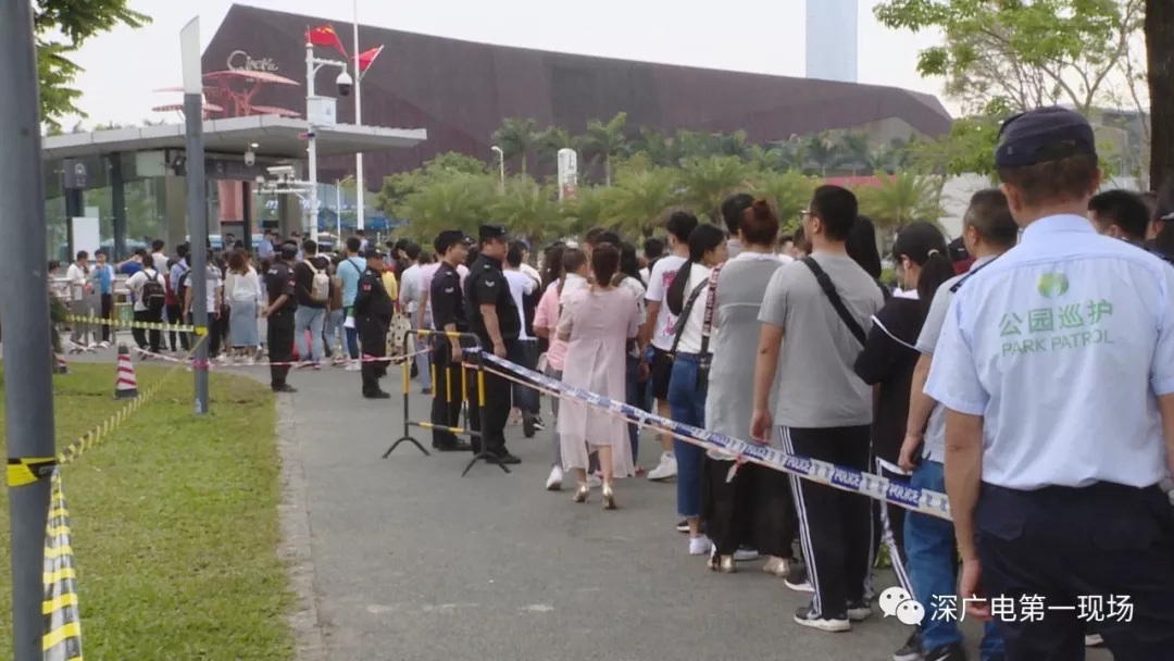從下午5點半開始,園內游客逐漸散去,深圳灣公園地鐵站兩個進站口外,排隊的人都超過了百米,安保人員增設了鐵馬來維持現(xiàn)場秩序。