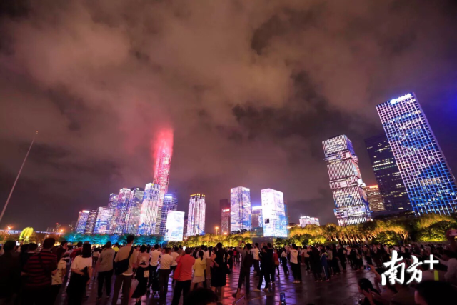 南方+客戶端2019年5月7日訊 5月1日18:40,剛剛來到深圳成為實習教師的趙同學,早早在市民中心占了位置,她發(fā)了一條朋友圈:“等待市民中心燈光秀的人從眾……”50分鐘后,福田中心區(qū)的43棟樓宇閃爍起五彩斑斕的燈光,照亮了她疲憊卻興奮的臉。