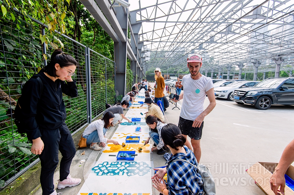 開(kāi)幕前,藝術(shù)家邀請(qǐng)公眾與志愿者共同完成花磚涂鴉作品《安全地帶》(主辦方供圖)