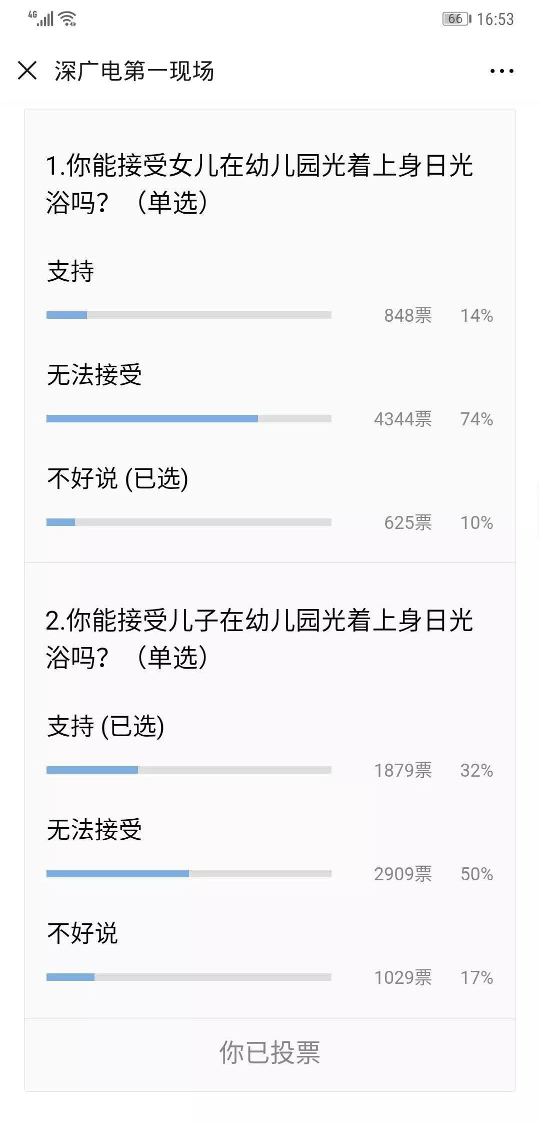 節(jié)目播出后,在第一現(xiàn)場(chǎng)微信公眾號(hào)上進(jìn)行的話題投票中,有74%的觀眾都認(rèn)為無(wú)法接受女兒在幼兒園光著上身日光浴,另外有50%的人認(rèn)為無(wú)法接受兒子進(jìn)行同樣的行為。