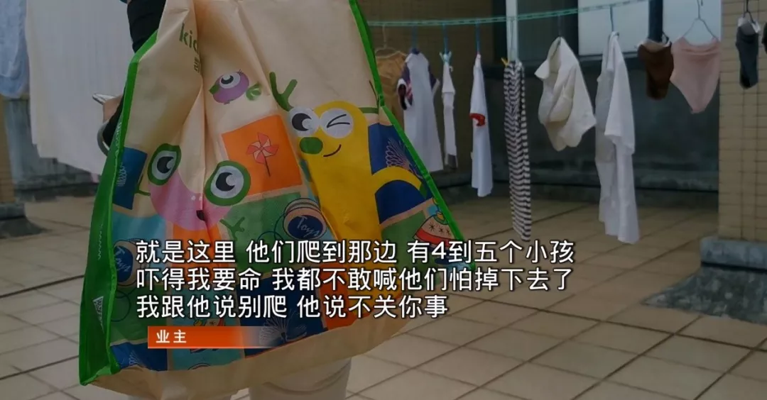 就在上周六,她親眼看到四五個(gè)孩子在天臺(tái)上四處攀爬,玩槍戰(zhàn),攔都攔不住。