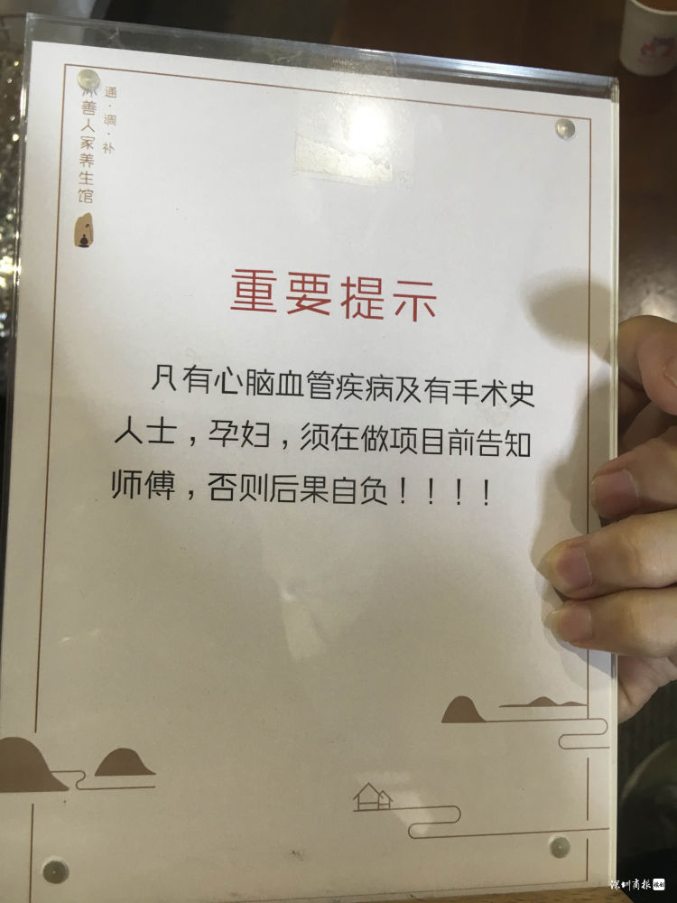 5月22日,讀創(chuàng) /深圳商報記者來到了該養(yǎng)生館,該養(yǎng)生館仍在正常營業(yè)。記者發(fā)現,店家在桌子上擺放了重要提示:凡有心腦血管疾病及有手術史人士、孕婦,須在做項目前告知師傅,否則后果自負!李小姐告訴記者,這是她母親出事后才增加的,正骨等項目已被店家從美團上撤下。
