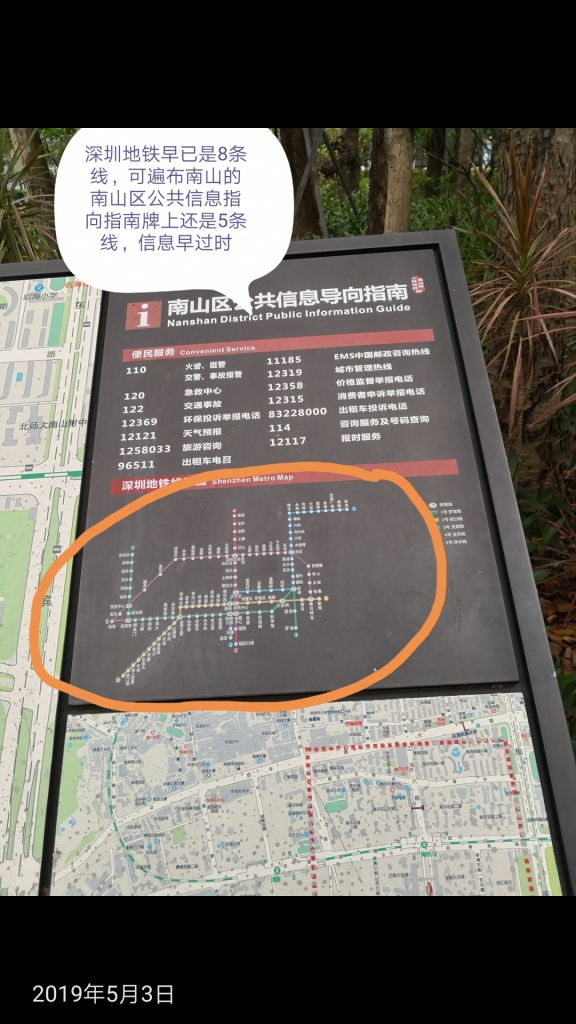 南山區(qū)“公共信息導向指南”指示牌中的地鐵路線信息嚴重滯后(網(wǎng)友供圖)↑