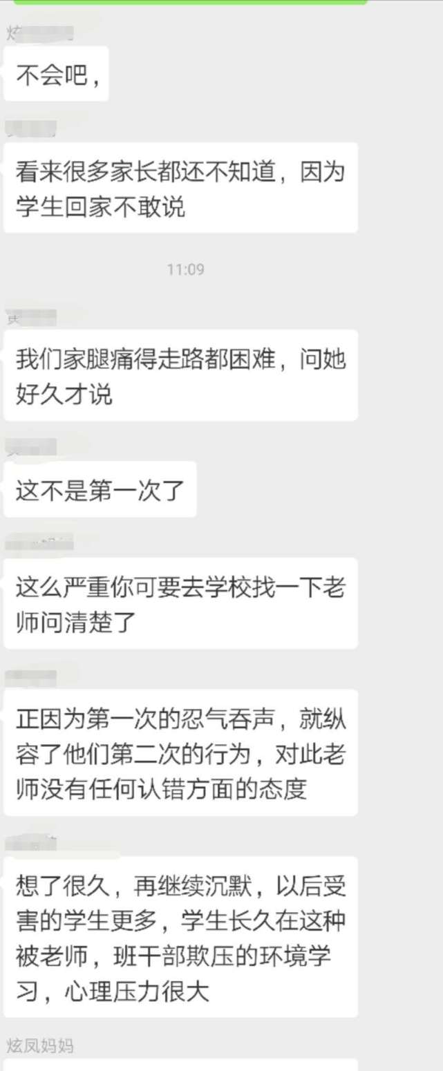 王先生把女兒的情況反映到家長(zhǎng)群里,結(jié)果群里的家長(zhǎng)紛紛表示,自己的孩子也反映當(dāng)天遭遇到班長(zhǎng)的毆打,有的孩子甚至“腿疼得難以走路”。而據(jù)孩子反映,其實(shí)類(lèi)似的毆打在班上已經(jīng)不止發(fā)生過(guò)一次。這名班長(zhǎng)是女生,平時(shí)很受班主任的信任,經(jīng)常利用班干部的權(quán)力隨意懲罰學(xué)生。“她曾經(jīng)多次要求班上同學(xué)給自己帶零食吃,不然就會(huì)被撕作業(yè)和毆打,還威脅不準(zhǔn)告訴家長(zhǎng)。”王先生稱(chēng),家長(zhǎng)們已經(jīng)將情況反映給班主任,但是班主任的反應(yīng)“相當(dāng)冷淡”,只是說(shuō)會(huì)了解一下情況。25日下午,記者電話(huà)聯(lián)系到了王先生女兒的班主任,他表示已經(jīng)就此事對(duì)班長(zhǎng)進(jìn)行了批評(píng)教育,但對(duì)于班長(zhǎng)此前多次毆打同學(xué)的行為他表示并不知情,“當(dāng)初讓這名同學(xué)做班長(zhǎng)是因?yàn)樗煽?jī)好,而且守紀(jì)律。而且我覺(jué)得,孩子之間有些矛盾很正常?!卑嘀魅握f(shuō)。(記者 李東明)