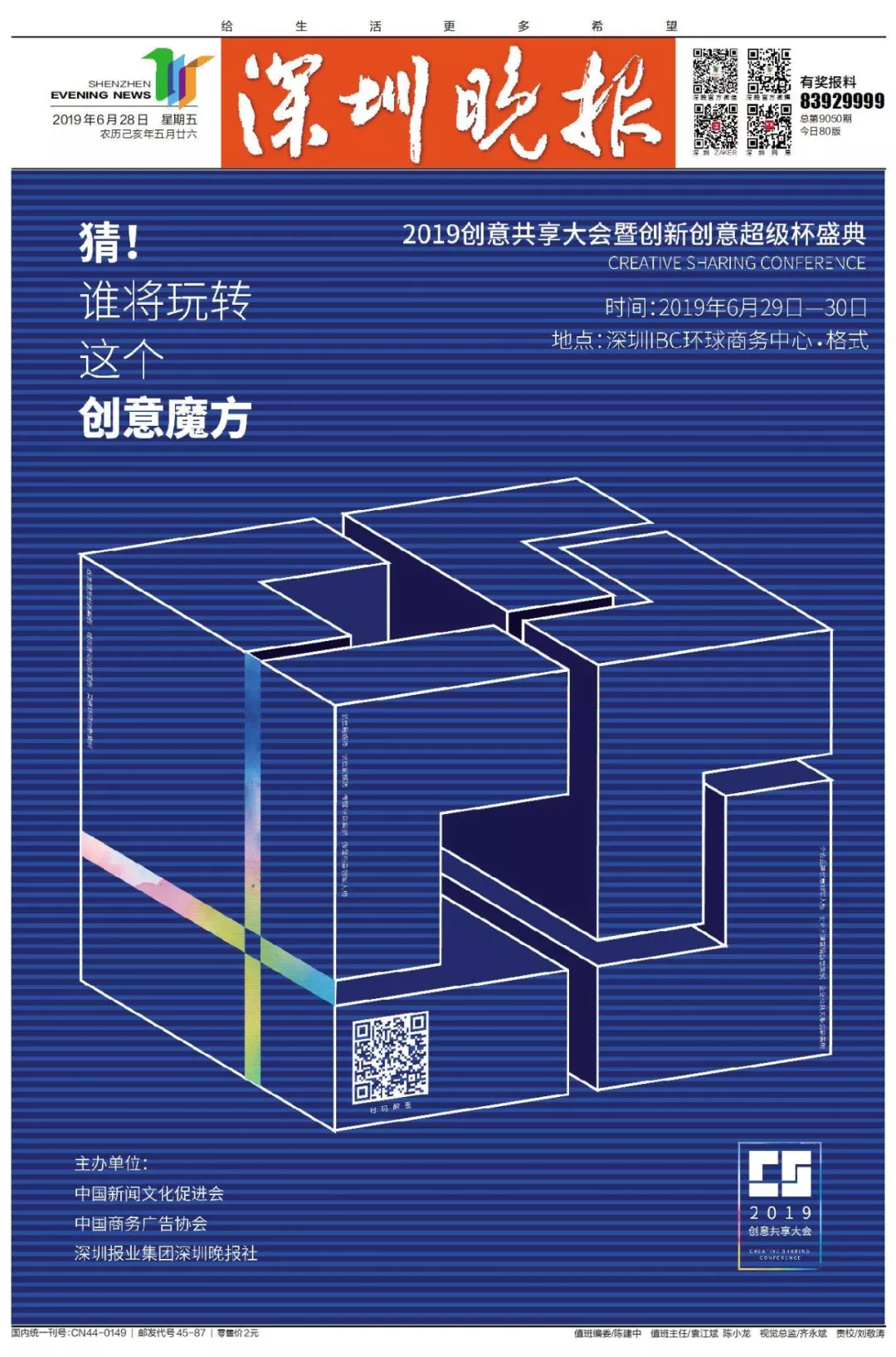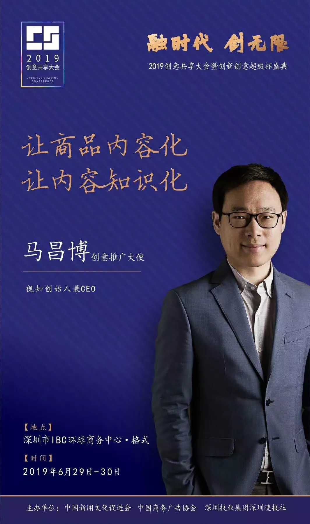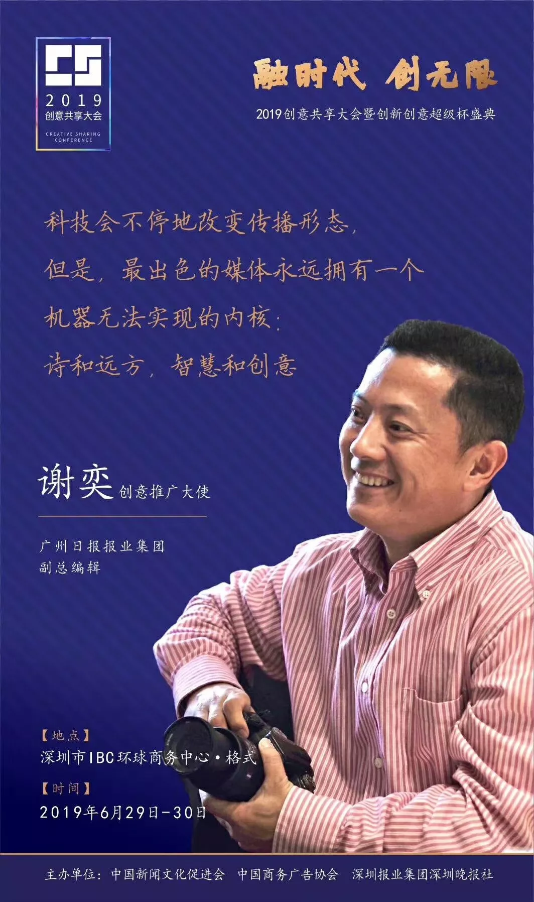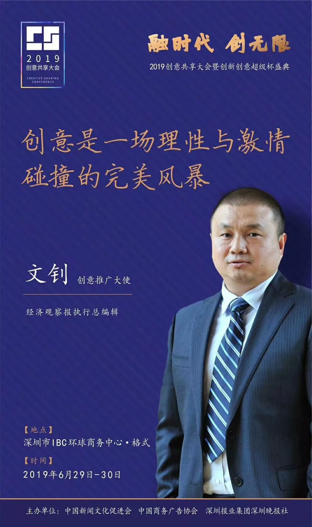 為了展現(xiàn)創(chuàng)意中國的精神風(fēng)貌和創(chuàng)意傳媒的文化力量,構(gòu)建創(chuàng)新創(chuàng)意共同體,擘畫美好圖景和未來趨勢,2019年6月29日至30日,由中國新聞文化促進(jìn)會(huì)、中國商務(wù)廣告協(xié)會(huì)、深圳報(bào)業(yè)集團(tuán)深圳晚報(bào)社等聯(lián)合主辦的“融時(shí)代創(chuàng)無限——2019創(chuàng)意共享大會(huì)暨創(chuàng)新創(chuàng)意超級杯盛典”將在深圳市IBC環(huán)球商務(wù)中心隆重舉辦。