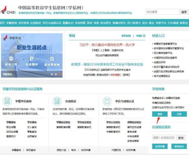 進(jìn)入學(xué)信網(wǎng)網(wǎng)址:http://www.chsi.com.cn/,打開之后點(diǎn)擊下圖提示的地方