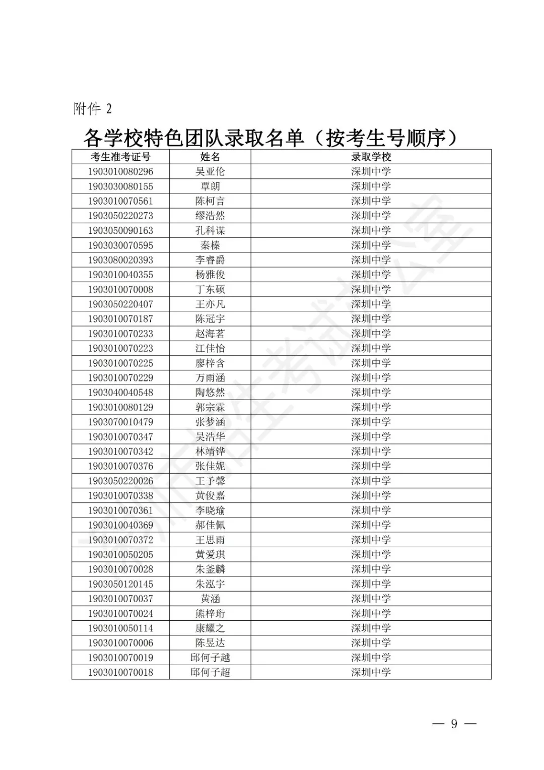 深圳公布2019年公辦高中特色團隊錄取標準 附錄取名單