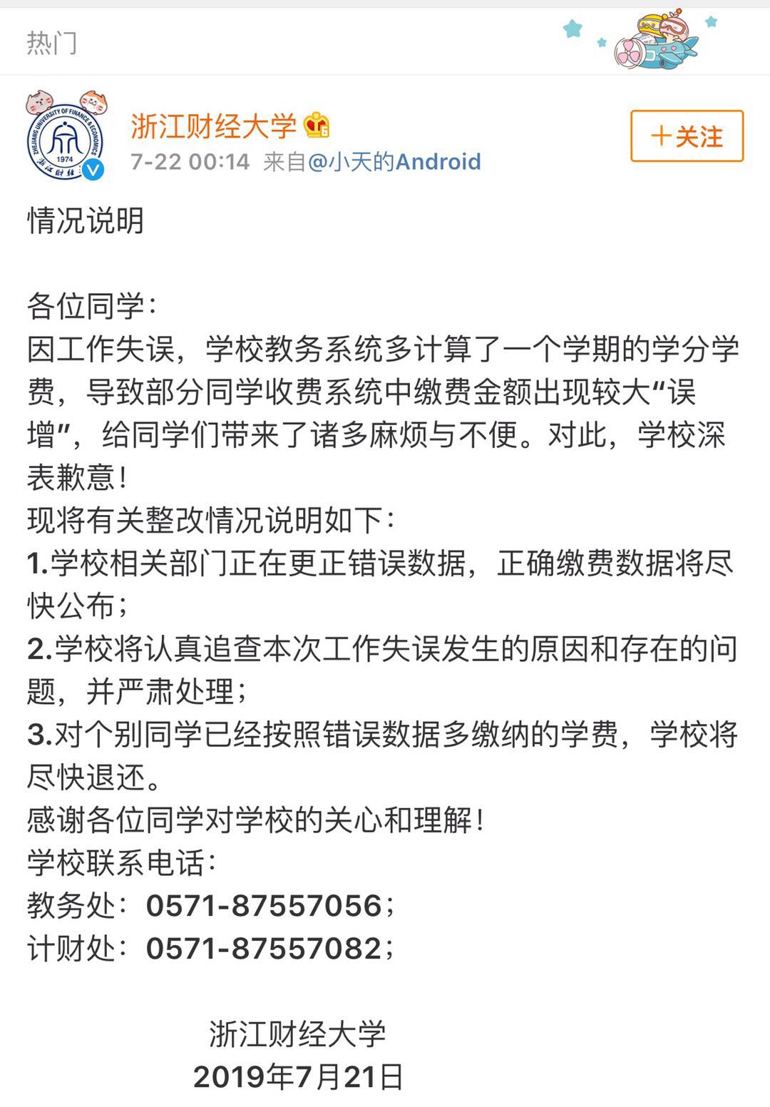 22日,浙江財經(jīng)大學(xué)就此事作出回應(yīng):算錯學(xué)費