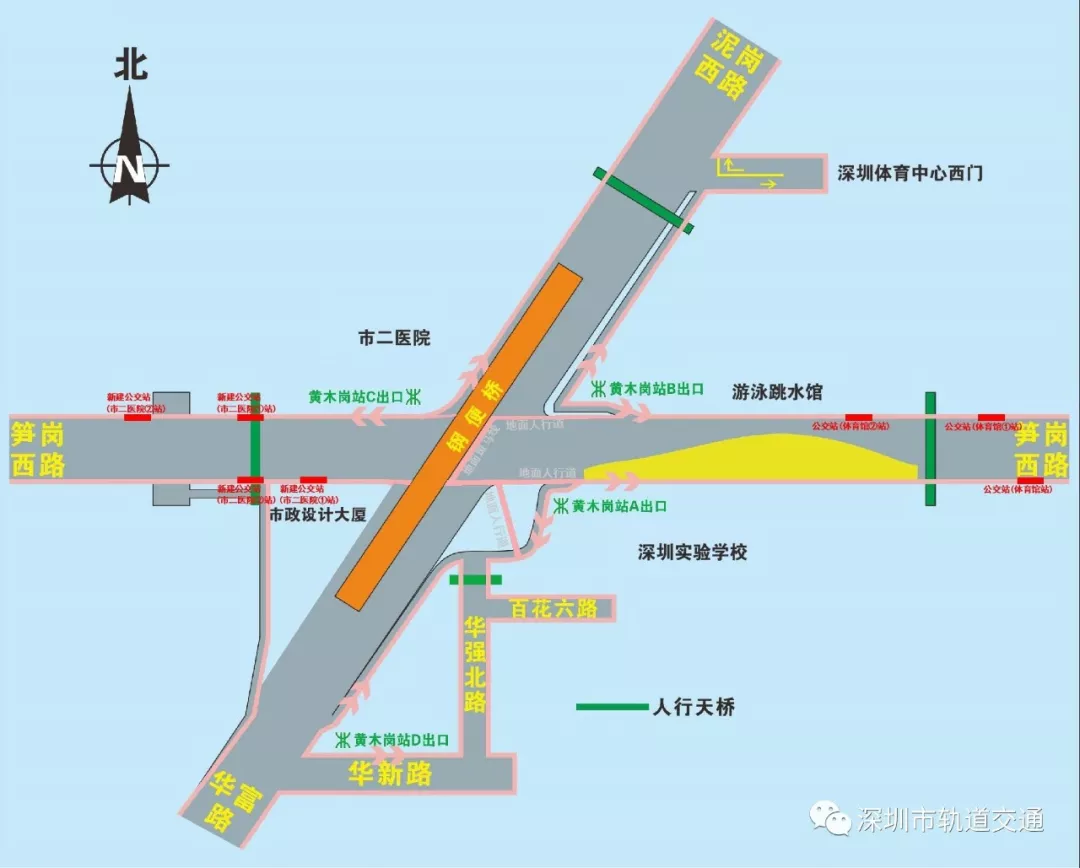 在本次調整中,華富路-泥崗西路南北向交通只能通過鋼便橋雙向六車道行車。泥崗西路、華富路、筍崗西路左轉,行人線路及“市二醫(yī)院”,“體育館”公交站臺均有所調整。