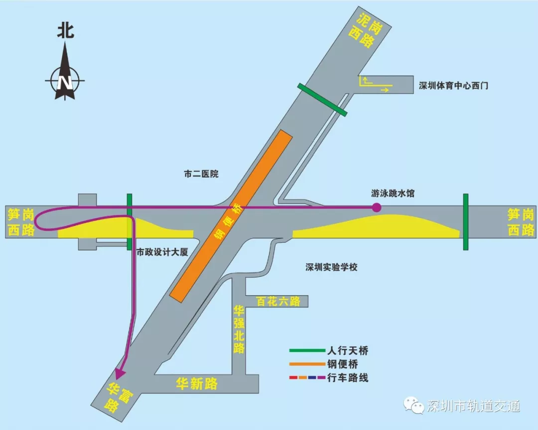 東轉(zhuǎn)南(筍崗西路左轉(zhuǎn)華富路):筍崗西路向西直行通過(guò)原平交路口,隨后在掉頭口處掉頭,通過(guò)華富支路,實(shí)現(xiàn)左轉(zhuǎn)華富路。(詳見(jiàn)圖6)