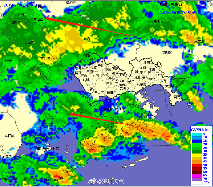 當(dāng)一條雨帶的長(zhǎng)軸和雨帶的移動(dòng)方向(箭頭)夾角很小時(shí),某個(gè)地方就會(huì)被這條雨帶幾乎從頭到尾地經(jīng)過,于是這個(gè)地方的累計(jì)雨量就會(huì)特別大。而現(xiàn)在深圳靠南的大部分區(qū)域就在經(jīng)歷一場(chǎng)列車效應(yīng),所以這場(chǎng)雨持續(xù)時(shí)間比較長(zhǎng),短時(shí)間內(nèi)停不下來。