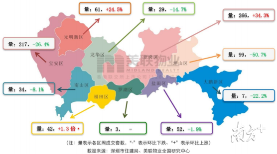按照十區(qū)的成交分布來看,除羅湖無對(duì)比數(shù)據(jù)外,上周福田、龍崗和光明三區(qū)一手住宅成交量環(huán)比呈上升趨勢(shì),深圳其余六區(qū)一手住宅成交套數(shù)均下降。其中龍崗區(qū)和寶安區(qū)分別以266套和217套的成交量居于成交排行前兩位,環(huán)比分別上升34.3%和下降26.4%。而成交42套的福田區(qū)成為上周一手住宅成交量環(huán)比增幅最大的區(qū),增幅約1.3倍。