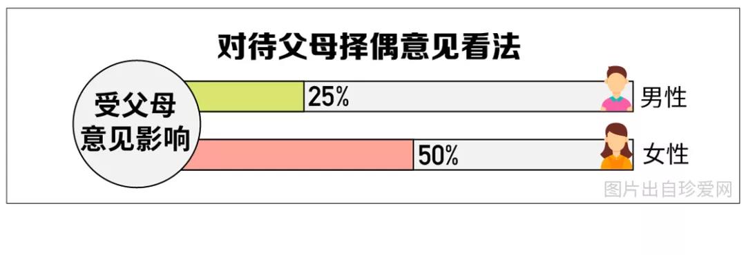 面對(duì)父母的擇偶建議,50%的女性會(huì)受到父母意見影響,僅25%的男性會(huì)受到影響,可見,女性比男性更“聽媽媽的話”。另外,從地域來(lái)看,“本地土著”青年更容易受到父母的影響。
