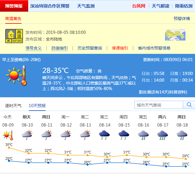 預(yù)計(jì)9日高溫天氣持續(xù),最高氣溫34-36℃,局地37℃或以上;10-11日多云有陣雨或雷陣雨;12-15日,陰天間多云有陣雨或雷陣雨,部分時(shí)間雨勢大。